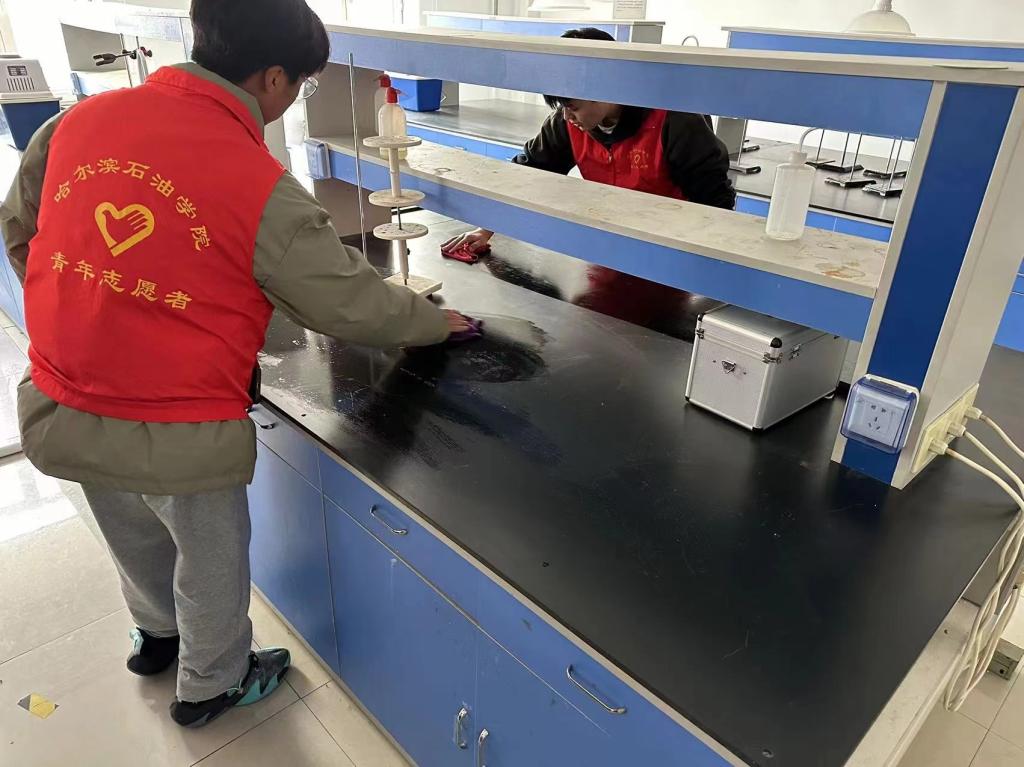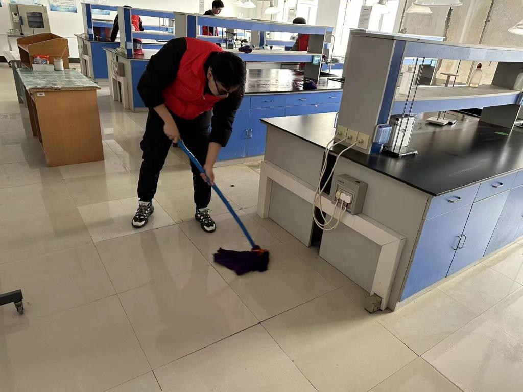 志愿者们分工明确,组织有序,开展室内外志愿服务活动,室外志愿者们来到篮球场,确保地面无纸屑、烟头、以及明显污渍,把篮球场每一个角落都打扫得干干净净。实验室内,志愿者们积极地清扫地面,擦拭实验台与仪器,将仪器进行相应的整理摆放,并针对室内卫生死角进行细致的清理,为同学们营造一个干净整洁的实验环境。志愿者们积极性高、配合默契、以劳动为荣,时刻发扬着志愿精神和大学生的优良风貌。