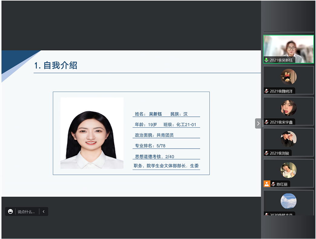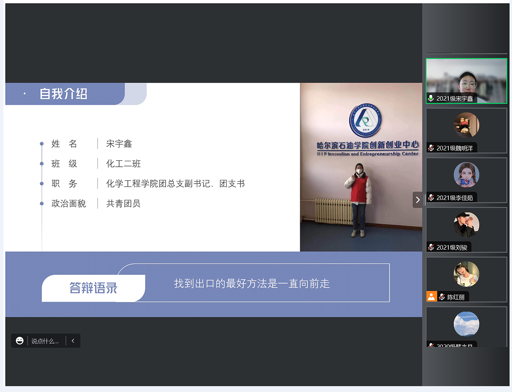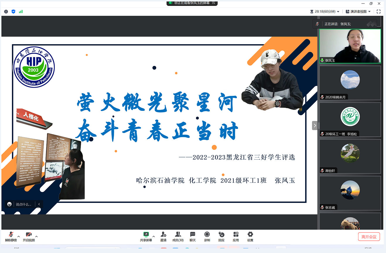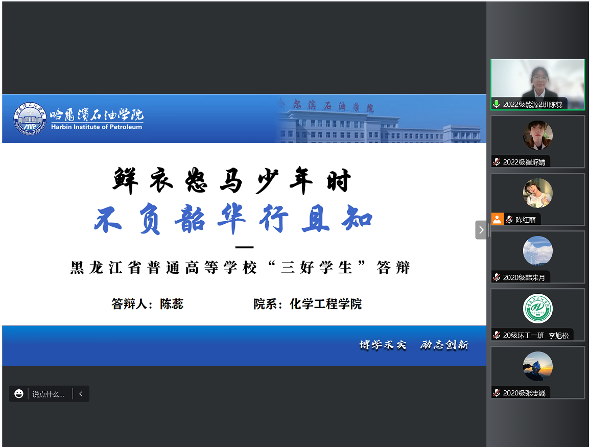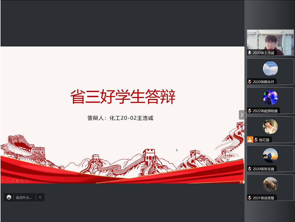 答辩会上,赵婧老师宣读黑龙江省三好学生评选流程、评选办法及评选条件后,21名申请人结合PPT依次进辩。申请人从自我介绍、思想政治表现、学习成绩、学科竞赛、社会实践、志愿服务等各个方面取得的突出成绩进行答辩。每位参与答辩的化工学子始终秉持着在生活和学习中积极向上、帮助同学的初心,努力学好专业知识、专业技能,发挥先锋模范作用。根据评审小组成员的评分,确定学院最终推荐名单:2020级:李旭松、韩来月、王浩诚、高怡轩、李文阅;2021级:宋宇鑫、张凤玉、刘骏、李丹、徐美慧、李佳茹、魏明洋、赵晨曦、吴新钰;2022级:陈蕊、崔垿婧、孙苏钰、陈红丽、贺柯豪、杨康。党总支书记徐宏莉对此次评审答辩会进行总结,她对参加答辩的同学所取得的成绩给予了充分肯定,同时也鼓励化工学子们勇于展示自我,积极参与学术、科研、创新创业等活动,希望同学们不忘初心,肩负时代使命,相信自己,努力拼搏,勇往直前,在未来书写美丽人生。