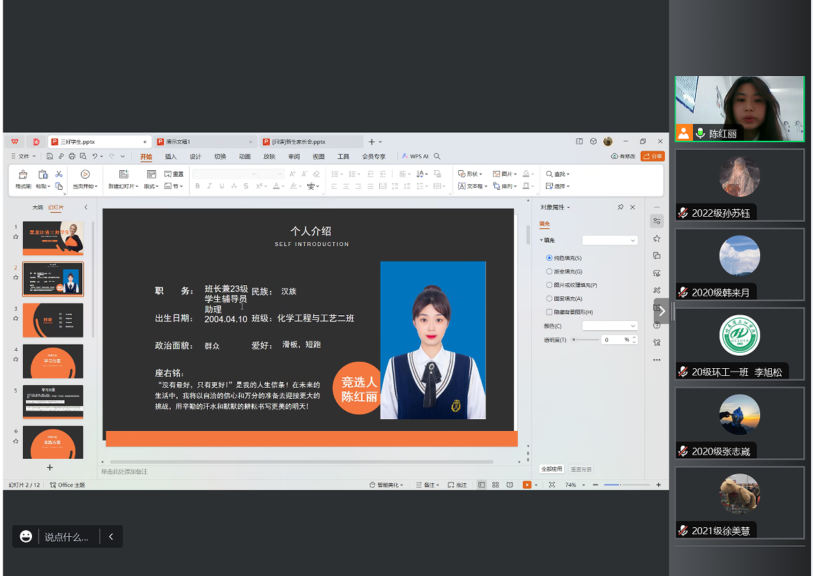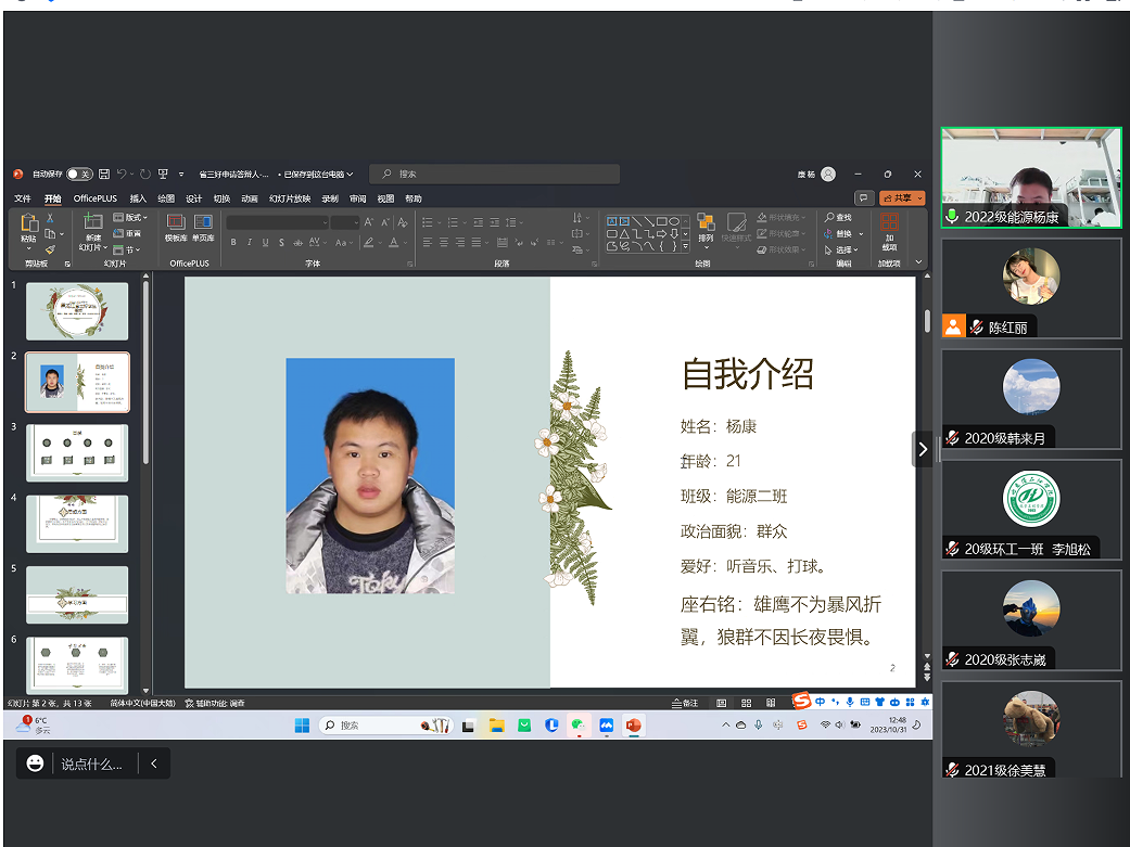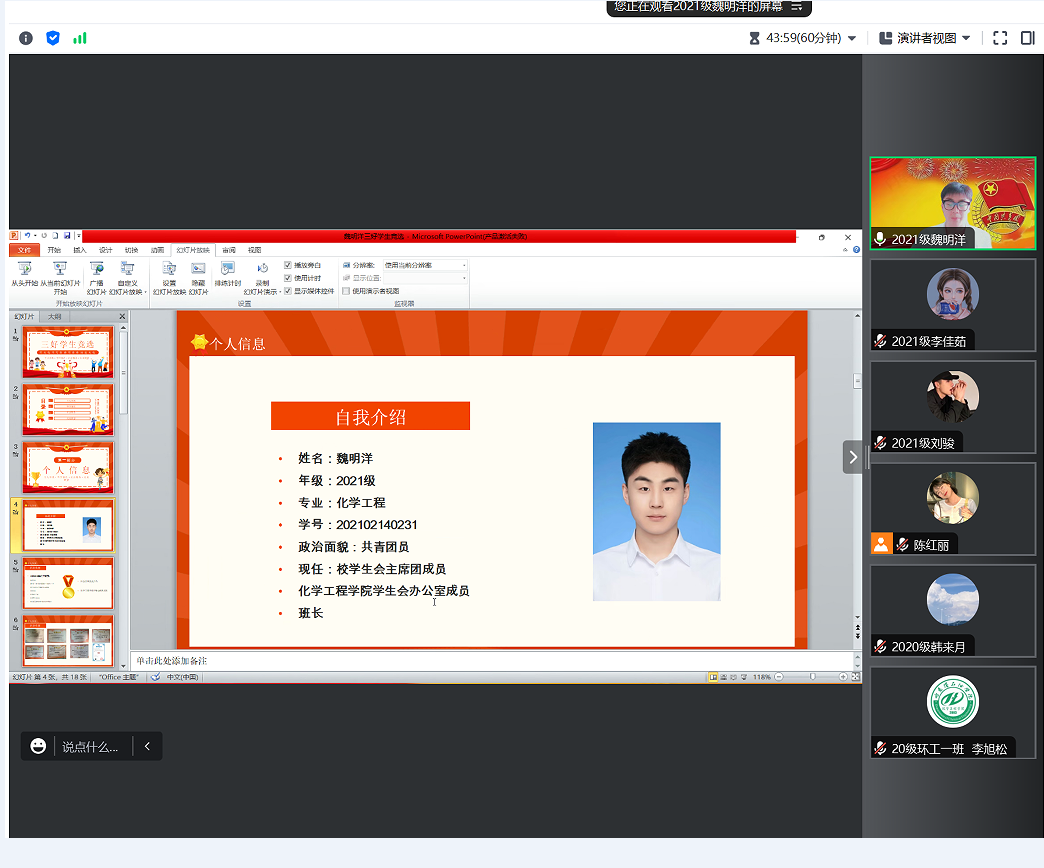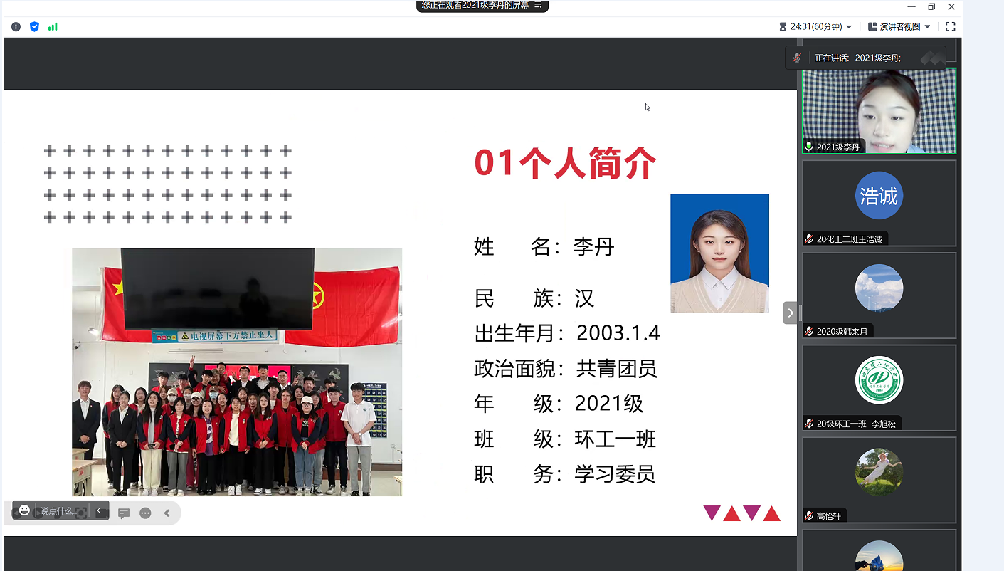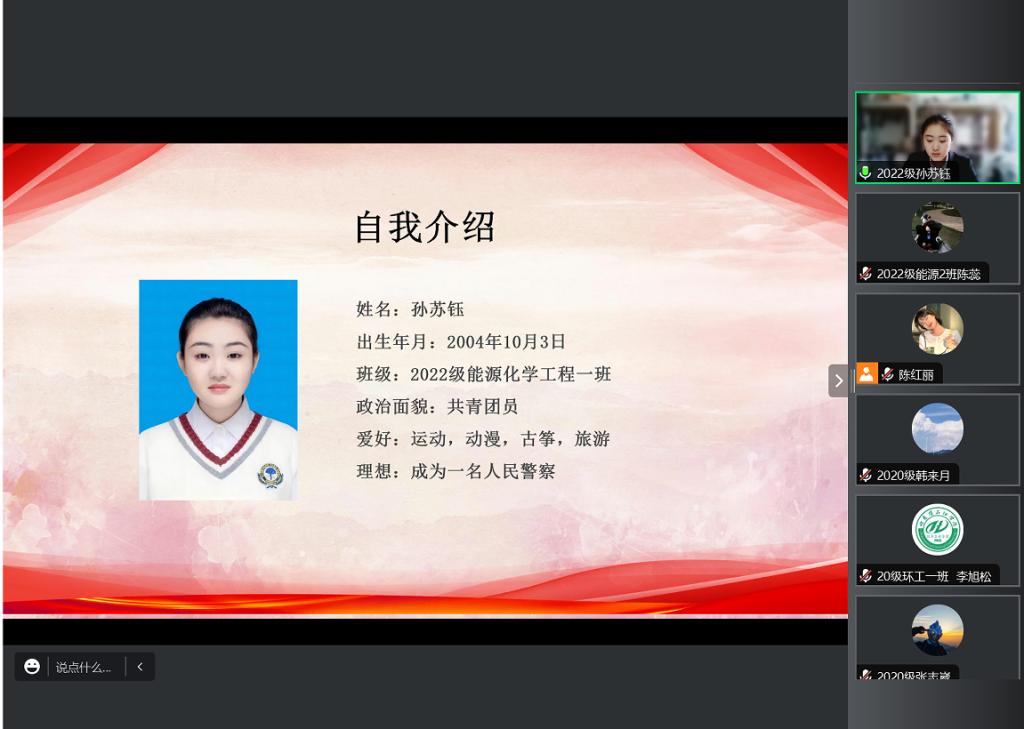 答辩会上,赵婧老师宣读黑龙江省三好学生评选流程、评选办法及评选条件后,21名申请人结合PPT依次进辩。申请人从自我介绍、思想政治表现、学习成绩、学科竞赛、社会实践、志愿服务等各个方面取得的突出成绩进行答辩。每位参与答辩的化工学子始终秉持着在生活和学习中积极向上、帮助同学的初心,努力学好专业知识、专业技能,发挥先锋模范作用。根据评审小组成员的评分,确定学院最终推荐名单:2020级:李旭松、韩来月、王浩诚、高怡轩、李文阅;2021级:宋宇鑫、张凤玉、刘骏、李丹、徐美慧、李佳茹、魏明洋、赵晨曦、吴新钰;2022级:陈蕊、崔垿婧、孙苏钰、陈红丽、贺柯豪、杨康。党总支书记徐宏莉对此次评审答辩会进行总结,她对参加答辩的同学所取得的成绩给予了充分肯定,同时也鼓励化工学子们勇于展示自我,积极参与学术、科研、创新创业等活动,希望同学们不忘初心,肩负时代使命,相信自己,努力拼搏,勇往直前,在未来书写美丽人生。