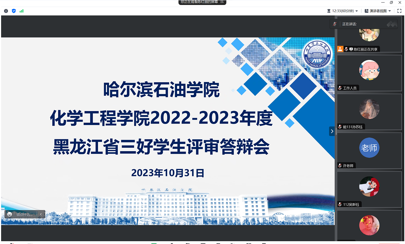 为全面落实立德树人根本任务,培养德智体美劳全面发展的社会主义建设者和接班人,树立好标杆、形成典型示范,2023年10月31日,化学工程学院召开2023年黑龙江省三好学生评审答辩会。院长杨昕、党总支书记徐宏莉、副院长彭殿宝、党总支副书记赵婧、化学工程系系主任张晗、能源工程系系主任王智慧、环境科学与工程系系主任罗海斌、实验中心主任许伟峰成立评审工作小组对参评学生进行评审,党总支副书记赵婧主持本次会议。