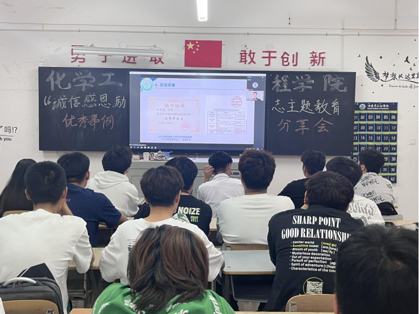 为进一步弘扬诚信文化,倡导诚信行,增强大学生感恩意识,做文明大学生的同时也大力宣传国家学生资助政策,以先进典型的榜样力量感召青年,2023年6月7日19时30分,化学工程学院于第二教学楼309室开展“诚信、感恩、励志”主题教育优秀示例分享会,分享会由我院优秀学子主讲。