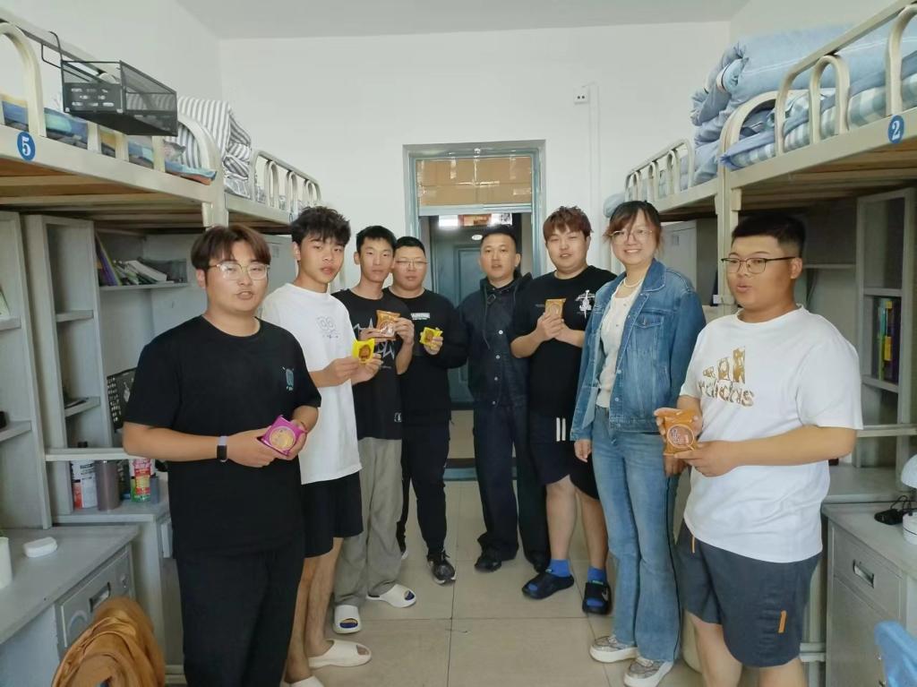 随后在走访寝室中,学院领导满怀关爱之情,亲自为留校同学发放月饼。每一份礼物都凝聚着学院对同学们的深切关怀与美好祝福。他们同新生们亲切交谈,特别关注了新生的身体健康状况,对他们在军训期间展现出的坚韧和毅力表示赞赏,勉励大家继续保持昂扬向上的精神面貌,为学院争光添彩。慰问现场气氛融洽,温馨的话语在师生间洋溢,同学们纷纷表示感受到了学院的关怀和温暖,并向老师们致以衷心的感谢。