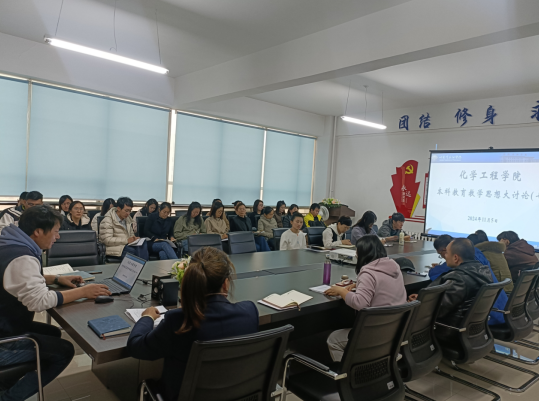 根据《化学工程学院开展本科教育教学思想大讨论实施方案》要求,11月5日,学院组织开展本科教育教学思想大讨论第七次集中学习讨论活动,学习活动由副院长彭殿宝主持,院长杨昕、党总支书记赵婧及学院全体教师参加。