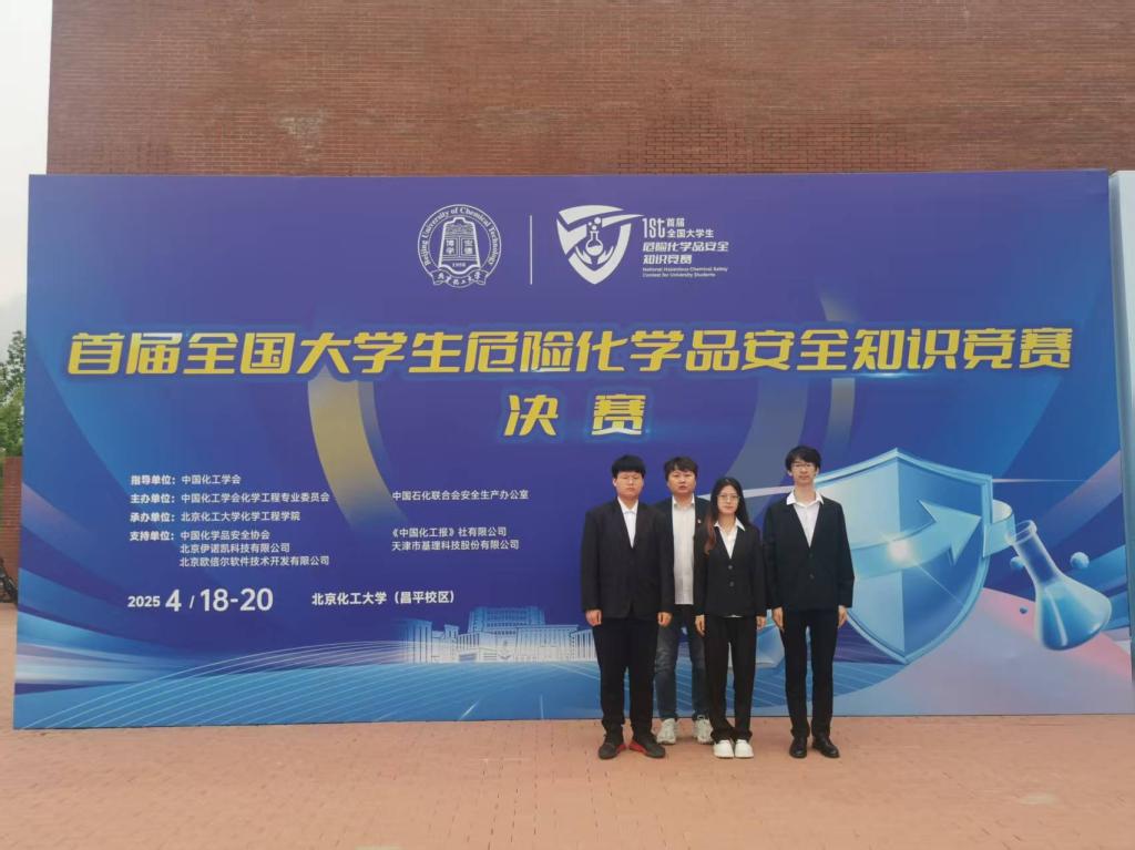 2025年4月19-20日,首届全国大学生危险化学品安全知识竞赛在北京化工大学昌平校区举行。由2022级化学工程与工艺专业王凤政、2023级化学工程与工艺专业刘杨、靳佳琪三位同学组成的“知无涯三人行”队凭借扎实的专业知识和出色的表现,在比赛中脱颖而出,荣获国家级三等奖,展现了化学工程学院在危险化学品安全教育和应用型人才培养方面的显著成效。