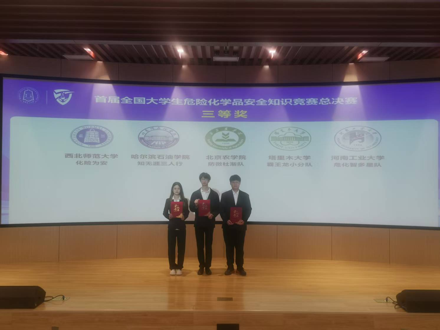 2025年4月19-20日,首届全国大学生危险化学品安全知识竞赛在北京化工大学昌平校区举行。由2022级化学工程与工艺专业王凤政、2023级化学工程与工艺专业刘杨、靳佳琪三位同学组成的“知无涯三人行”队凭借扎实的专业知识和出色的表现,在比赛中脱颖而出,荣获国家级三等奖,展现了化学工程学院在危险化学品安全教育和应用型人才培养方面的显著成效。
