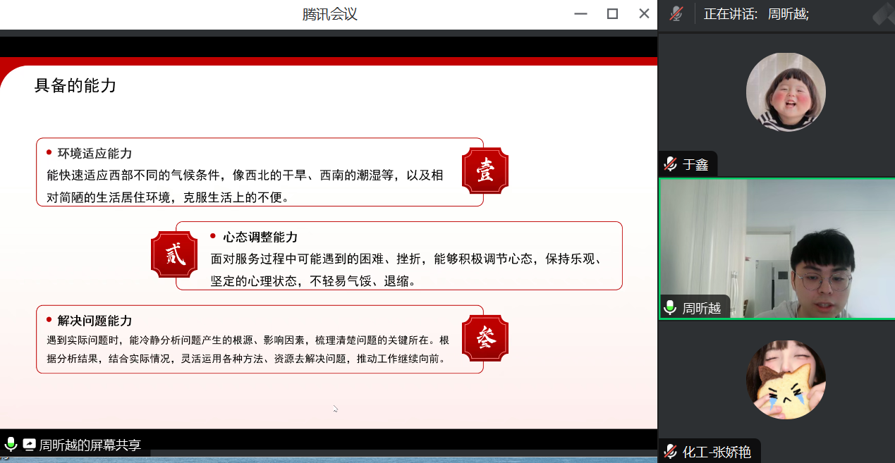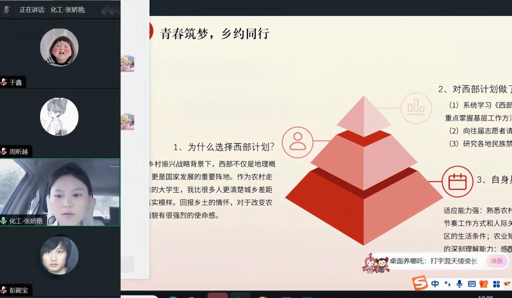 为深入贯彻落实国家大学生志愿服务西部计划战略部署,引导新时代青年扎根西部、奉献基层,5月15日,化学工程学院2025年大学生志愿服务西部计划面试工作通过线上平台顺利开展。
