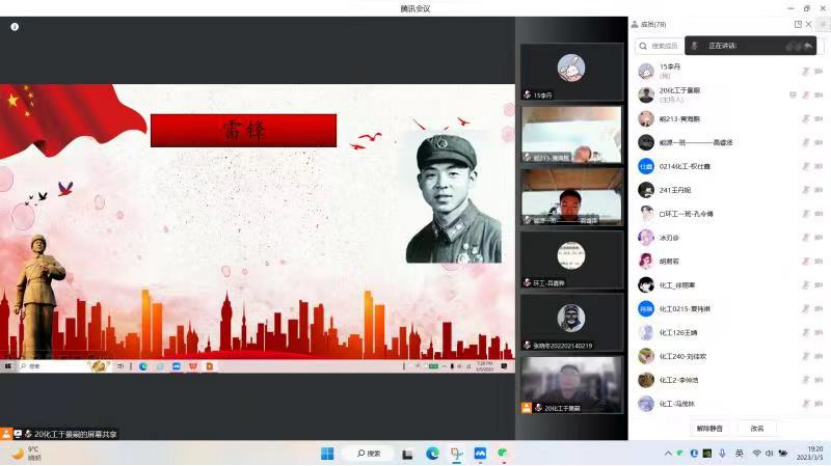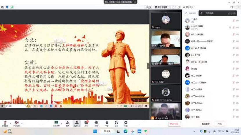 为全面贯彻习近平总书记对深入开展学雷锋活动作出的重要指示,培养化工学子的爱国主义思想和助人为乐的良好品质,并使雷锋精神赋予新的时代内涵,2023年3月5日19时20分,化学工程学院青年志愿者协会于线上开展“学雷锋,树新风”主题宣讲活动,2020级、2021级、2022级共70余人参加。