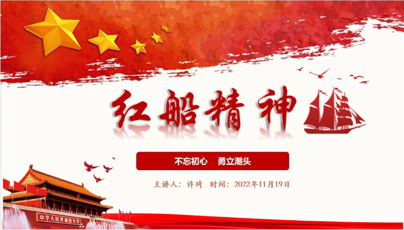 许琦讲解了红船精神—不忘初心,勇立潮头。今天,当中国共产党已经由一个革命政党发展为世界上最大的执政党,中国特色社会主义进入了新时代,我们唯有始终以习近平总书记提出和阐释的“红船精神”为鞭策,始终保持党的人民性特质,始终与人民同呼吸、共命运、心连心,才能把握好实现中华民族伟大复兴中国梦的未来。