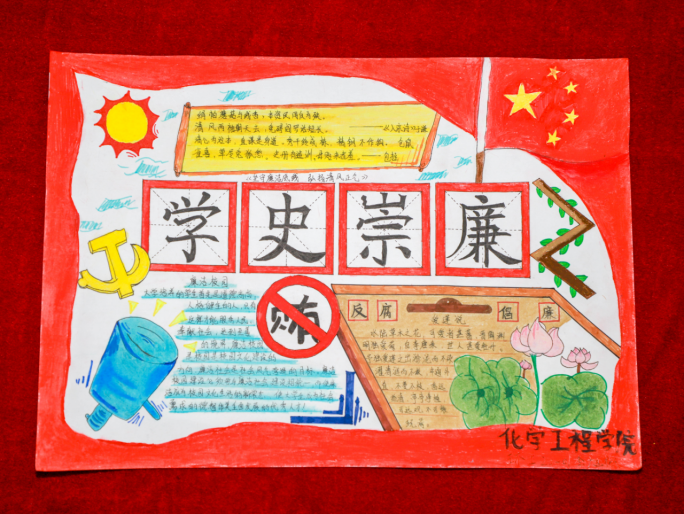 为进一步加强学校廉洁文化建设,培养学生廉洁文化精神,营造优良学风,形成以廉为荣、崇廉尚廉的文化氛围。2022年11月4日—6日,化学工程学院学生党支部组织开展“传统廉洁文化教育”主题手抄报活动,学生党支部全体在校学生9人参加。