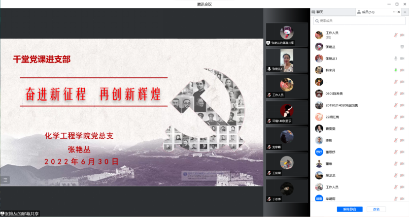 为深入贯彻落实省第十三次党代会精神,扎实推进学院党建工作,充分发挥学院党组织和广大党员服务龙江全面振兴全方位振兴的战斗堡垒作用和先锋模范作用,2022年6月30日13时30分,化学工程学院党总支通过腾讯会议线上开展“千堂党课进支部”之“奋进新征程、再创新辉煌”专题党课,由党总支书记张艳丛主讲,学院全体师生党员参加此次学习。