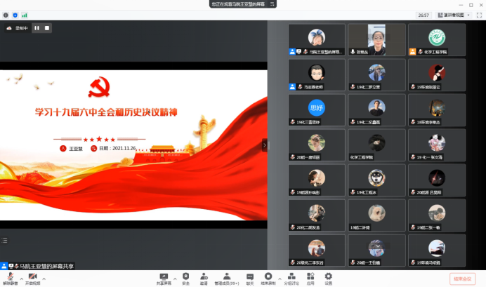 为深入学习领会党的十九届六中全会精神的丰富内涵和核心要义,深刻认识党的百年奋斗成就和历史经验,2021年11月26日18时,化学工程学院党总支开展“党的十九届六中全会精神”理论学习,由马克思学院王亚慧老师主讲,学院党总支书记张艳丛主持,学院全体教师、学生党员以及入党积极分子共200余人参加学习。