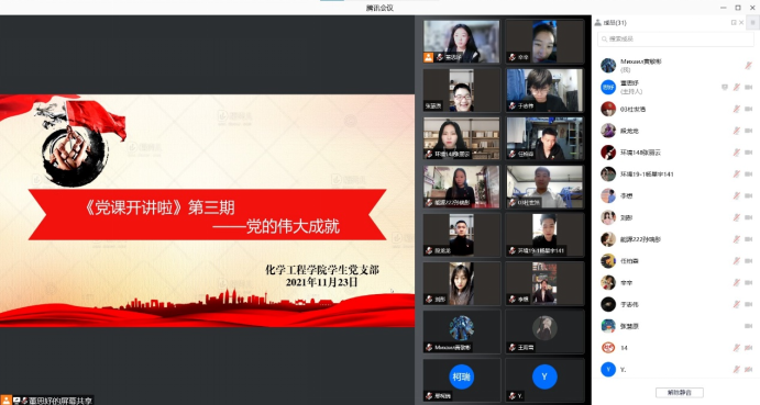 初心易得,始终难守。以史为鉴,可以知兴替。我们要用历史映照现实、远观未来,从中国共产党的百年奋斗中看清楚过去我们为什么能够成功、弄明白未来我们怎样才能继续成功,从而在新的征程上更加坚定、更加自觉地牢记初心使命、开创美好未来。为深入学习贯彻习近平总书记在庆祝建党100周年大会上的重要讲话精神,持续推进党史学习教育,2021年11月23日,化学工程学院学生党支部开展《党课开讲啦》第三期党课讨论活动,学生党支部书记于鑫、辅导员马志强及38名学生党员参加。