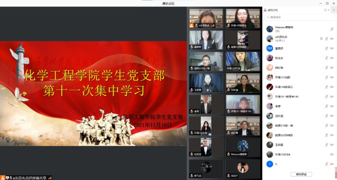 为扎实做好学生党员思想教育工作,进一步将党组织学习教育的成果转化为实效,2021年11月17日18时,化学工程学院学生党支部于线上开展第十一次集中理论学习,辅导员马志强与44名学生党员共同参加此次学习。