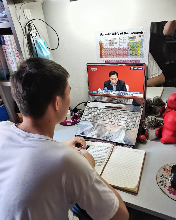 为持续深入学习习近平新时代中国特色社会主义思想,全面贯彻落实党的教育方针,自觉用党的创新理论武装头脑、指导实践、推动工作,提高政治判断力、政治领悟力、政治执行力。2021年11月12日,化学工程学院组织全体师生党员于线上观看十九届六中全会新闻发布会。
