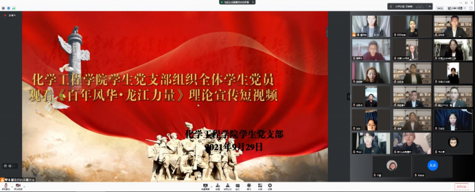 为庆祝中国共产党成立100周年,充分展示黑龙江省在党的领导下走过的壮阔历程和取得的辉煌成就,根据党史学习教育工作安排,化学工程学院学生党支部于2021年9月29日18时,在线上组织全体学生党员观看理论宣传短视频《百年风华·龙江力量》。