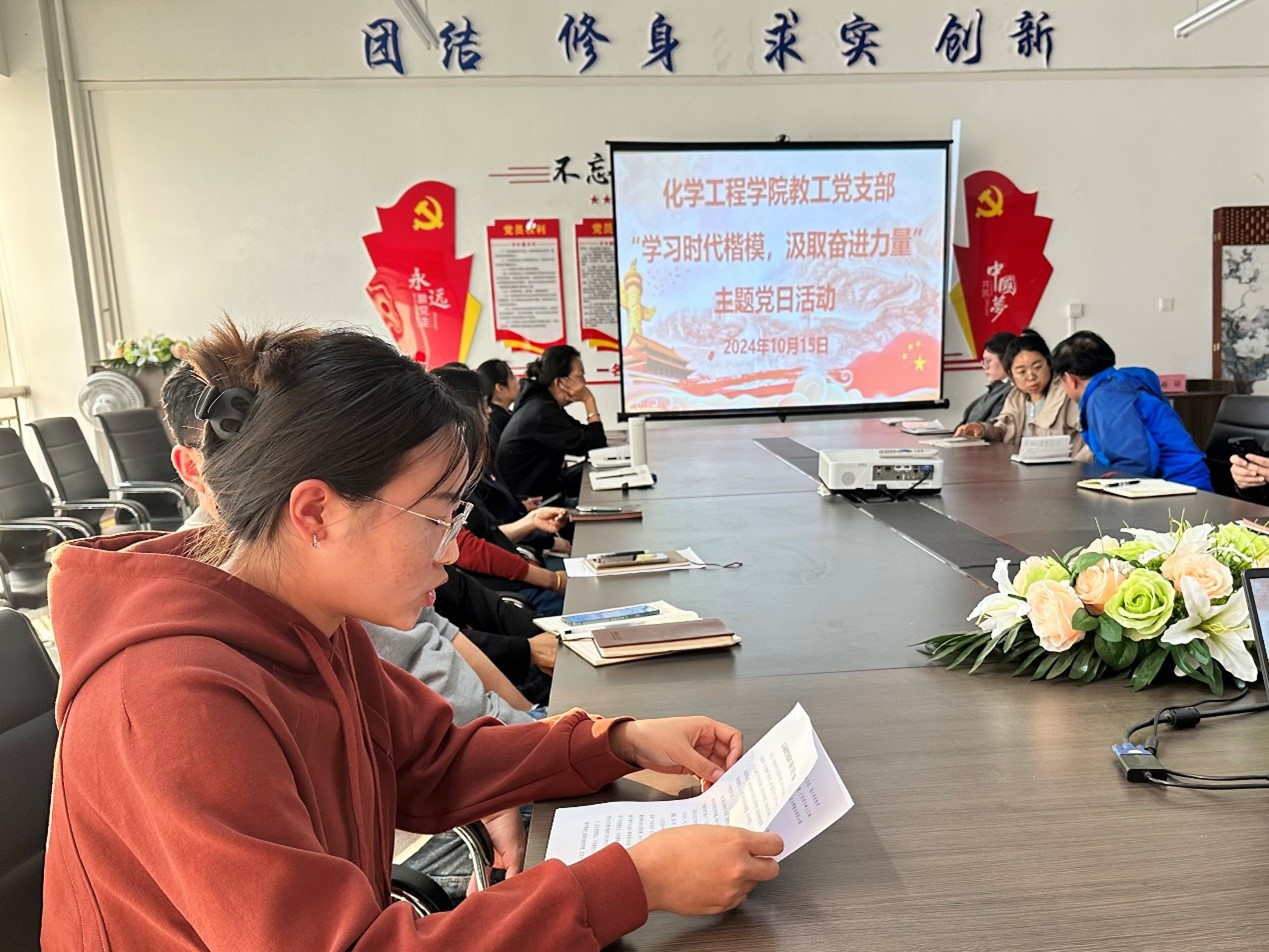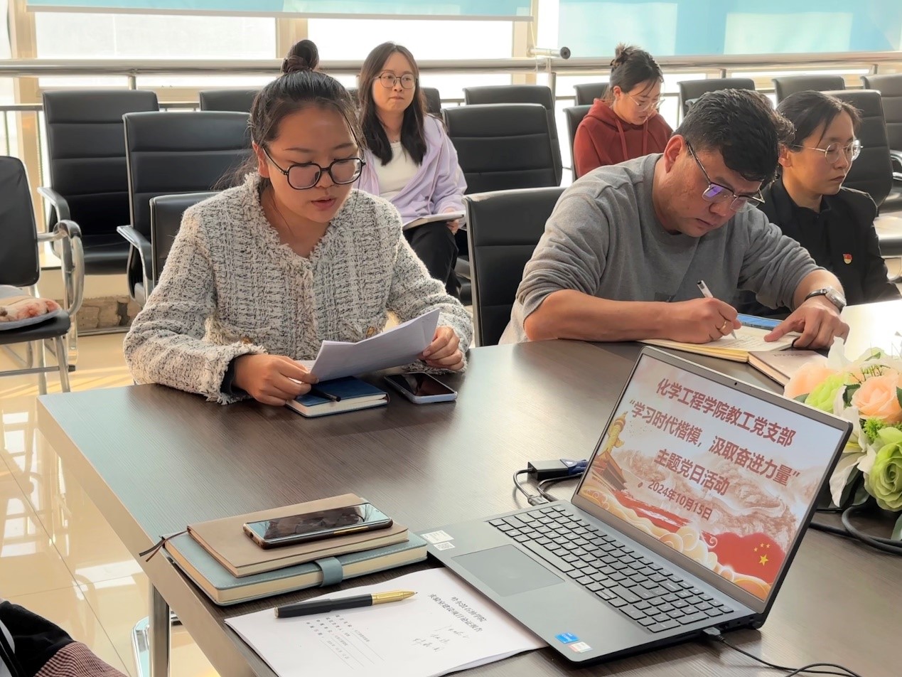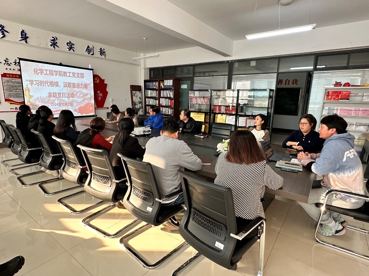 为深入学习时代楷模的先进事迹和崇高精神,大力弘扬教育家精神、科学家精神,引领支部党员同志汲取奋进力量,锐意进取、开拓创新、砥砺前行,营造风清气正的良好政治生态和育人环境。2024年10月15日,化学工程学院教工党支部在党员之家组织开展“学习时代楷模,汲取奋进力量”主题党日活动。支部全体党员同志参加。