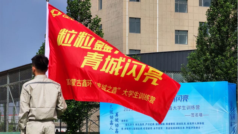 “粒粒鑫光,青城闪亮”大学生训练营授旗仪式环节,陈飞向2023届入职学生代表吴大龙授旗。新入职员工奋力挥舞着代表着梦想起航的红旗,宣告着本次训练营正式拉开帷幕。