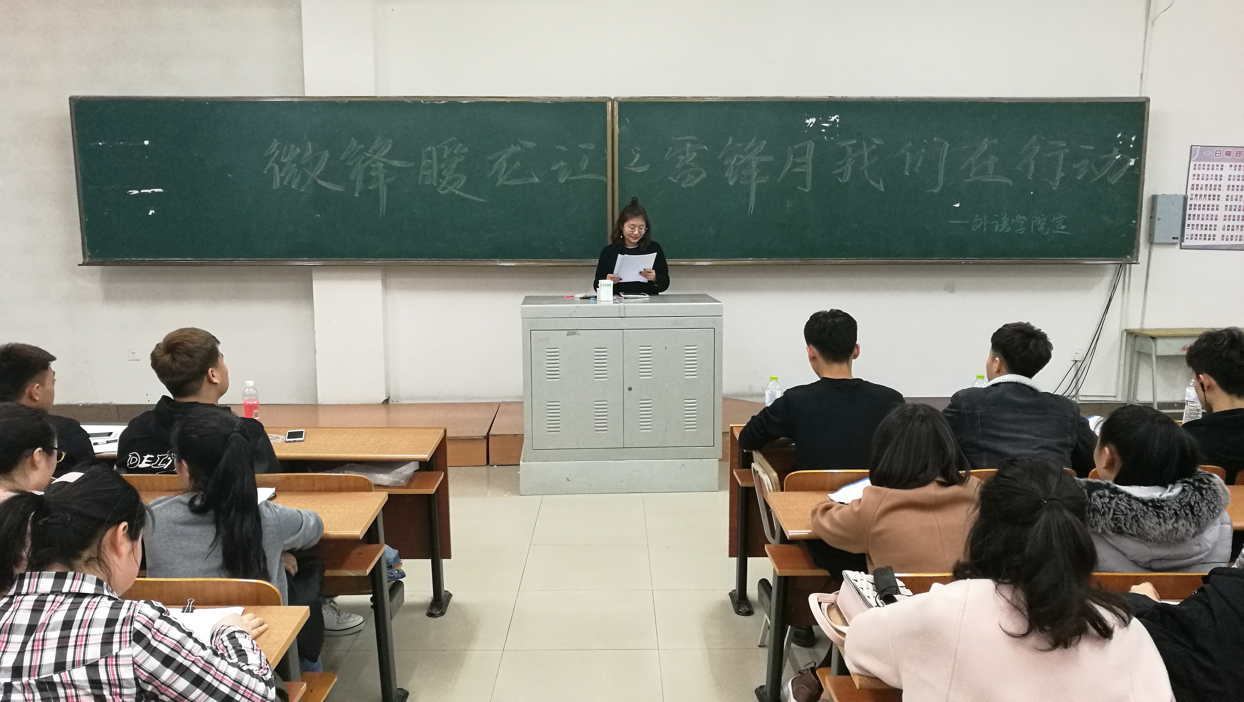 三月春风暖人心,雷锋精神伴我行。2017年3月5日下午5时30分,外语学院于主教517成功举办了“微风暖龙江—雷锋月我们在行动”主题活动。本次活动旨在营造积极践行社会主义核心价值观的浓厚氛围,激发青年学子树立远大理想,增强历史使命感和社会责任感,进一步在我院师生中广泛弘扬雷锋精神。出席本次会议的有外语学院青年志愿者协会会长杨天瑞、外语学院助导程成以及外语学院16级全体学生。