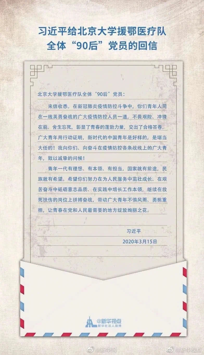 中共中央总书记、国家主席、中央军委主席习近平3月15日给北京大学援鄂医疗队全体“90后”党员回信,向他们和奋斗在疫情防控各条战线上的广大青年致以诚挚的问候。