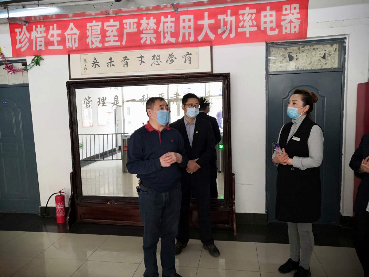 党委书记焦光纯还嘱托各工地、各部门工作人员要做好自身防护的同时,提高对疫情防控工作的认识,严把校园封闭关,严格执行“戴口罩、扫描健康码、测量体温、出入登记”的入校流程,为全体师生员工营造一个安全、稳定、和谐的工作和学习环境。