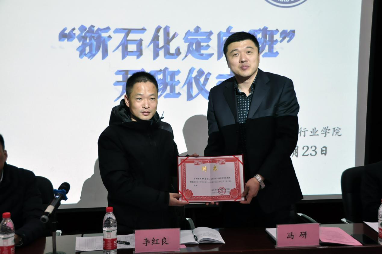 的称号,同时学校聘请浙江石油化工有限公司李红良经理为伟德bv国际体育客座教授,由冯研副校长颁发聘书;活动最后,校企领导与定向班学生合影留念。