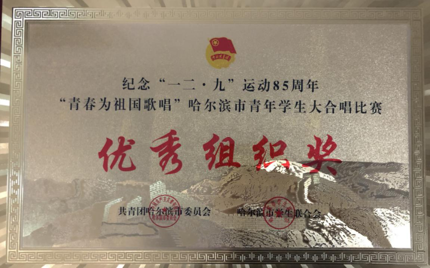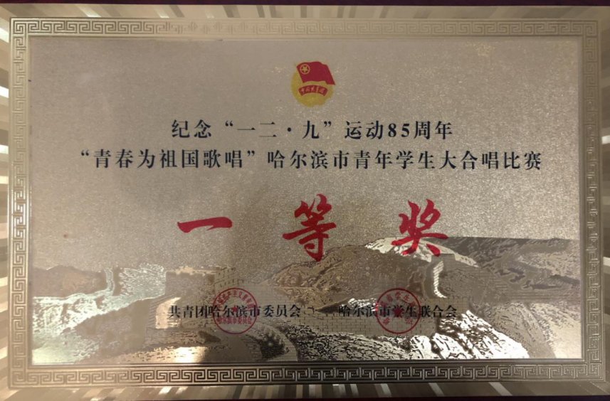 经过激烈角逐,最终伟德官网代表队以总分第一名的优异成绩,获得本次纪念“一二·九”运动85周年“青春为祖国歌唱”哈尔滨市青年学生大合唱比赛的一等奖及优秀组织奖。