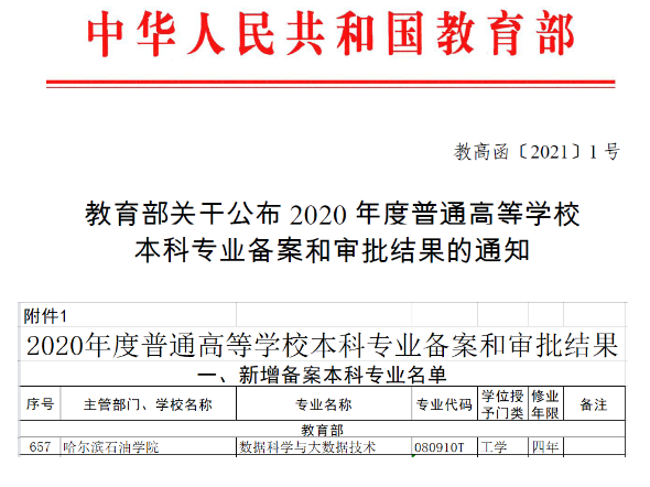 近日,教育部发布《关于公布2020 年度普通高等学校本科专业备案和审批结果的通知》(教高函[2021]1号),伟德官网推荐申报的数据科学与大数据技术专业获教育部批准设置,计划自2021年起开始招生。