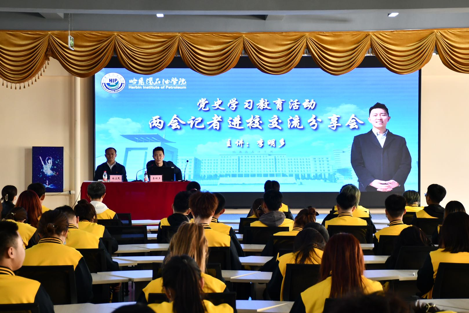 李明多现任黑龙江广播电视台记者、黑龙江省青年联合会委员,十余次获得黑龙江省新闻奖。他先后在《新闻夜航》、《游遍龙江》、《新闻联播》等栏目工作,现在主要负责黑龙江省重要时政新闻的报道工作,多次参与全国及全省两会时政报道。李明多记者本次的交流会让伟德bv国际体育的学生明确了党的创建、发展、壮大的历程,在庆祝中国共产党百年华诞的重大时刻,在“两个一百年”奋斗目标历史交汇的关键节点,我们集中开展党史学习教育,正当其时,意义重大。同时,他的学习和工作经历也为学生们指引了学习和奋斗的方向,帮助学生更好地规划学习生活,实现人生理想。