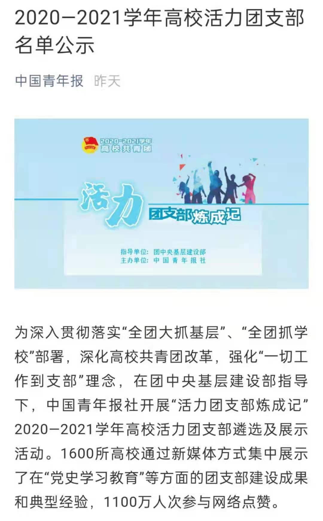 近日,中国青年报公布2020-2021学年高校活力团支部公示名单,伟德bv国际体育经济管理学院2019级市场营销专业三班团支部光荣入选公示名单,彰显了学院在深入开展高校共青团改革的突出成就。