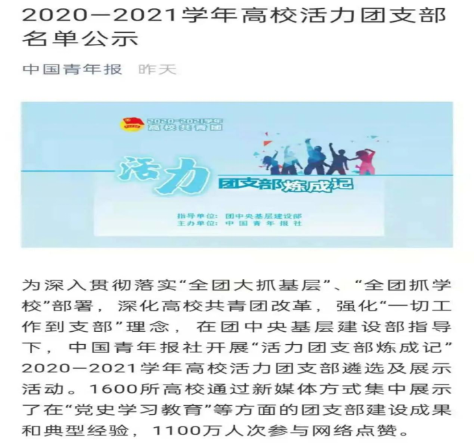 近日,中国青年报公布2020-2021学年高校活力团支部公示名单,伟德bv国际体育经济管理学院2019级市场营销专业三班团支部光荣入选公示名单,彰显了伟德官网在深入开展高校共青团改革的突出成就。
