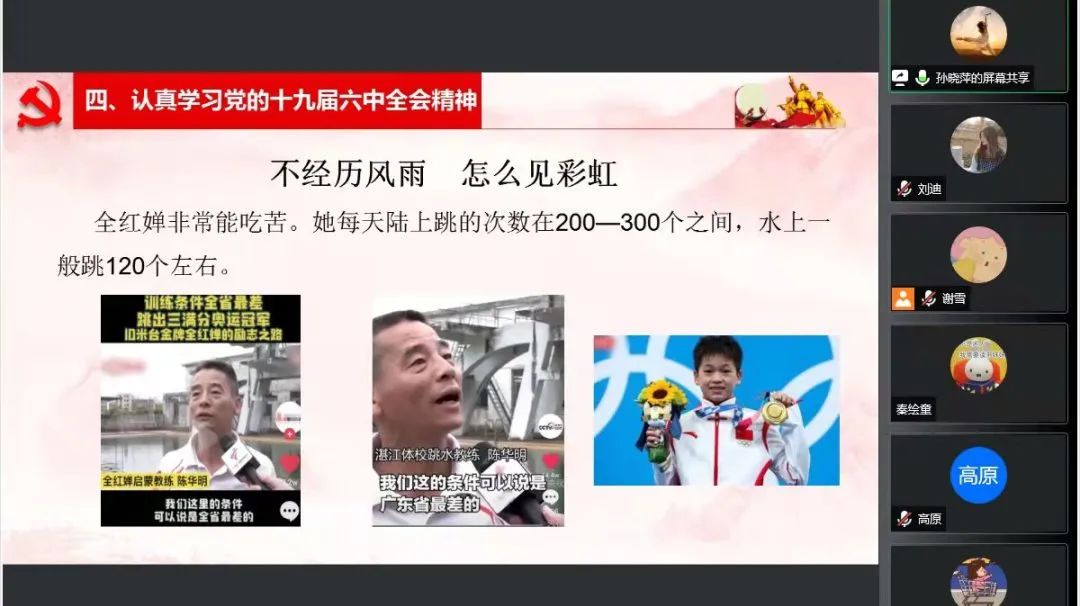 孙书记结合当下时事政治及学前教育学院专业实际,为学前教育学院师生党员带来了一场富有专业特色的党的十九届六中全会精神宣讲。宣讲过程中,孙书记围绕党的十九届六中全会召开背景、党的十九届六中全会核心要义、党的十九届六中全会重大意义、认真学习党的十九届六中全会精神四个方面,用丰富的史实、优秀的文艺作品和先进典型事迹,对全会精神进行了系统阐述和解读。孙书记全面、系统、准确、深入地宣讲了党的十九届六中全会精神,对学前教育学院全体党员学习贯彻全会精神具有积极的引导和启发作用。