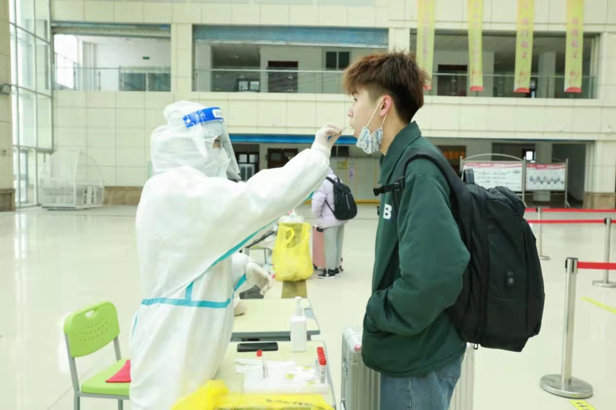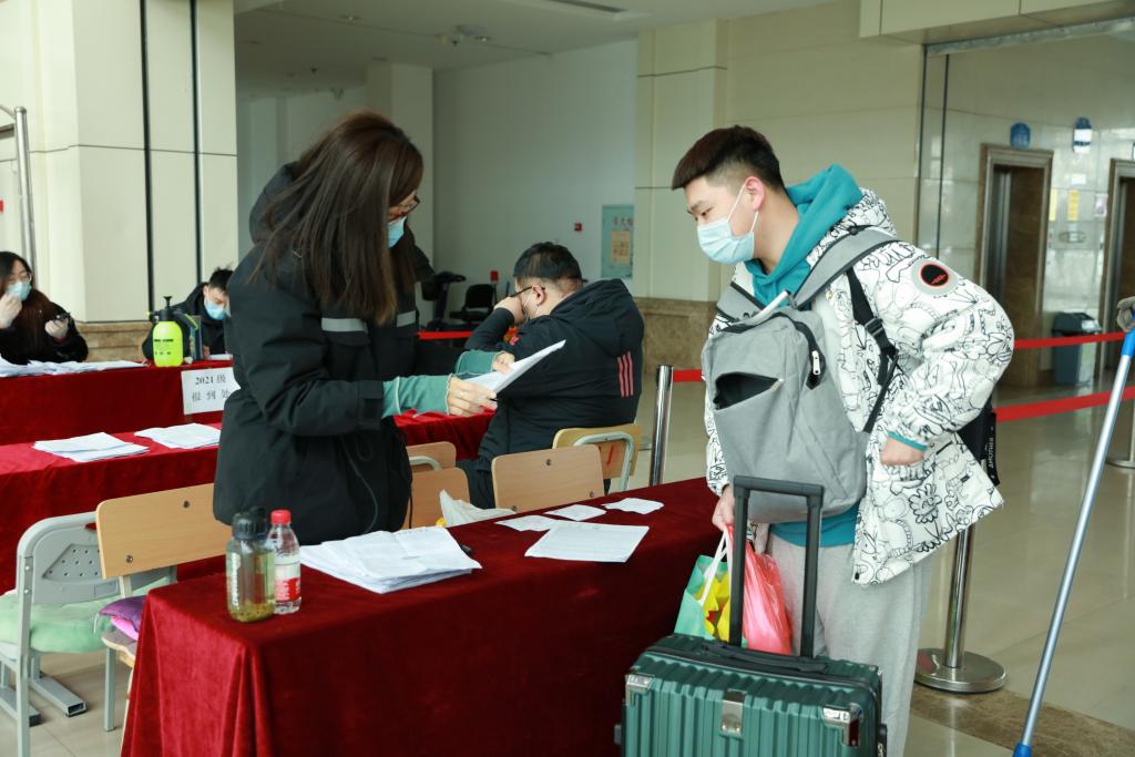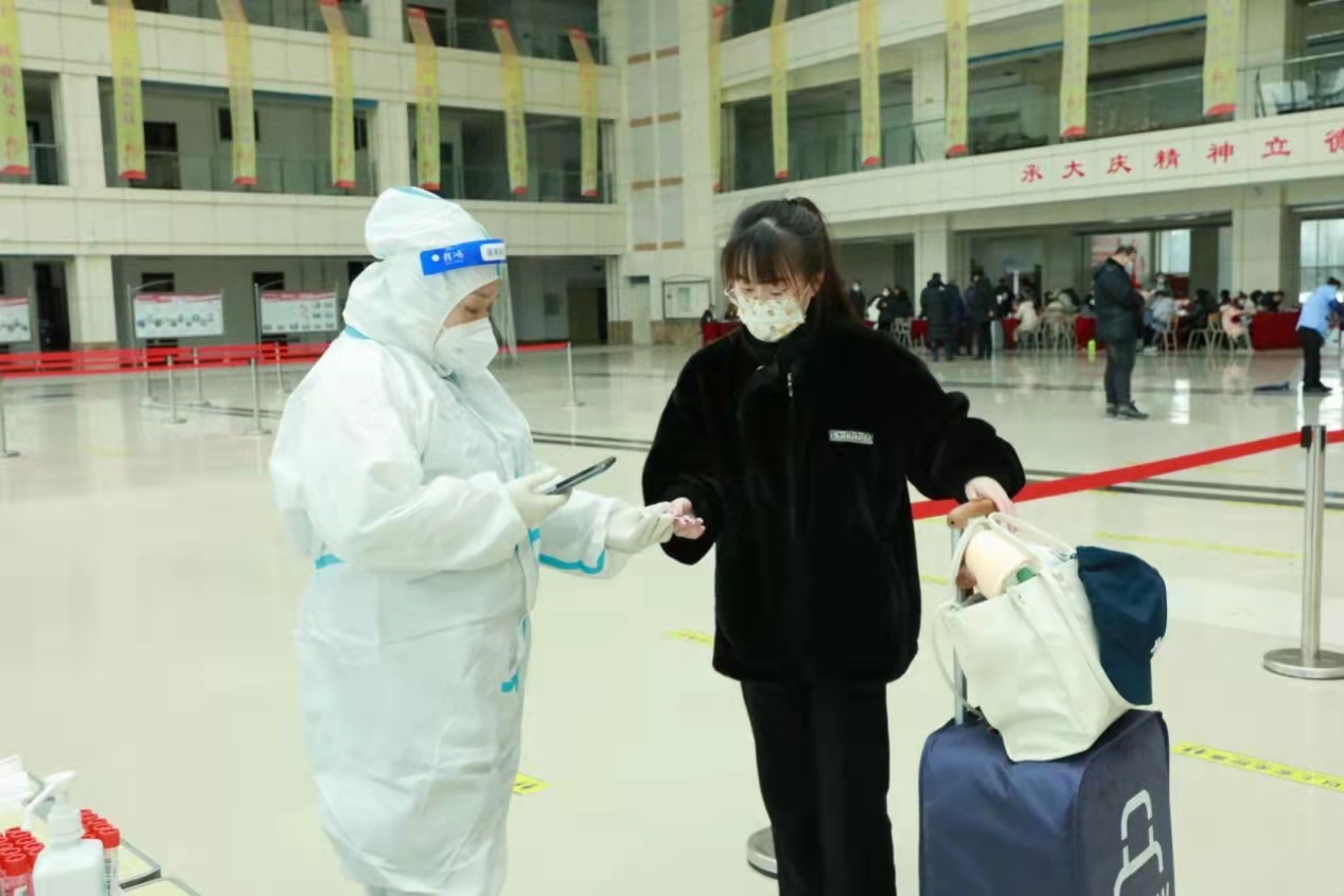 5日清晨,学生工作处、保卫处、后勤处、各二级学院等部门人员早早在学校南门、阳光大厅、学生公寓等地做好准备,学生们到校后每人间隔1.5米通过入检通道,严格执行出示“三码一证明”、测温、点对点入校、核酸检测等环节,保障返校学生平安健康。