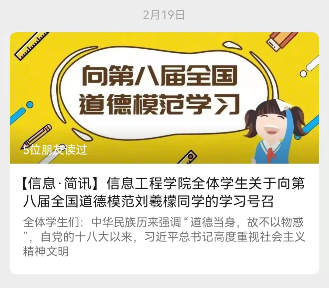 2月19日,信息工程学院在学院官方公众平台发表一则向第八届全国道德模范刘羲檬同学的学习号召,号召全体学生学习刘羲檬同学顽强的意志、坚强的毅力和永不服输的精神。用自己的青春与热血把自己的理想投入到建设中国特色社会主义事业的道路中去,弘扬中华民族特有的文明,为进一步搭建祖国美好未来,而贡献属于信息学院的力量!