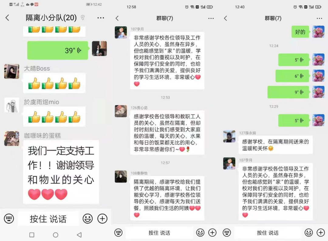 一道隔离门,隔离的是疫情带来的风险隐患,却隔不断哈油教职员工对学生们的关爱之情。同学们在收到“爱心礼包”后,十分感动,反响强烈。自动控制工程学院杨扬同学说,“因为家乡有疫情,所以到校后就直接进入隔离间了,从入校到入住,学校都安排的十分妥当,令我和远在家里的爸爸妈妈都十分感动,学校今天又给我们送来了新鲜的水果和营养品,实在是太暖心、太惊喜了!谢谢学校为我们所做的一切。我们一定积极配合校园防疫工作,顺利度过这段“孤独但幸福着”的隔离期。”