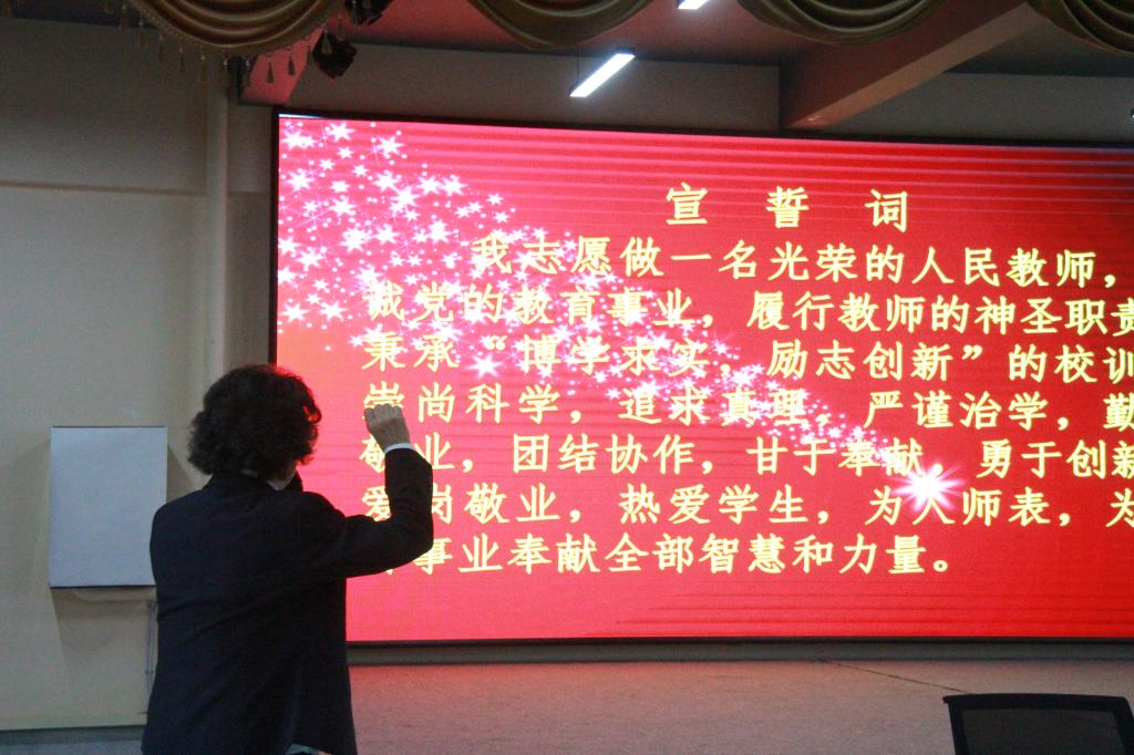 随后由总督学于惠力教授带领全体新进教师进行入职宣誓。全体教师起立,右手握拳齐眉,郑重宣誓:“我志愿做一名光荣的人民教师,忠诚党的教育事业,履行教师的神圣职责……为教育事业付出全部智慧和力量!”现场气氛庄重严肃,责任感、使命感油然而生。