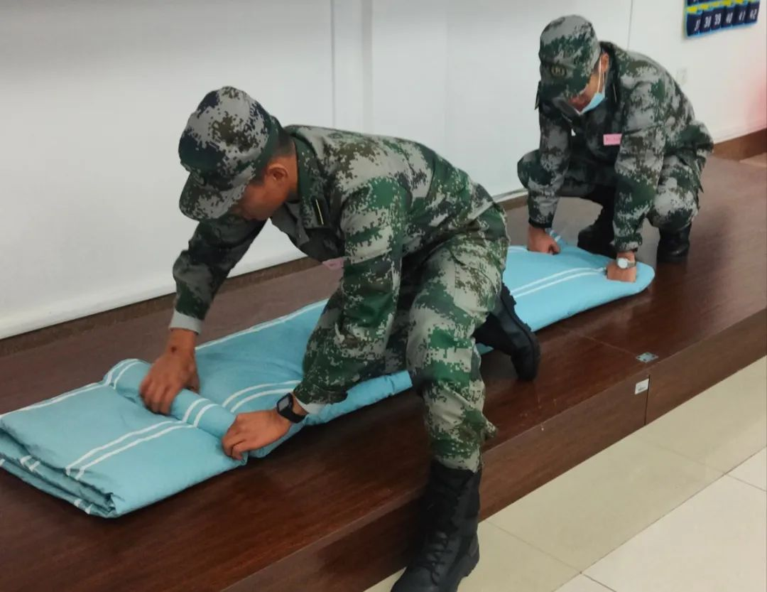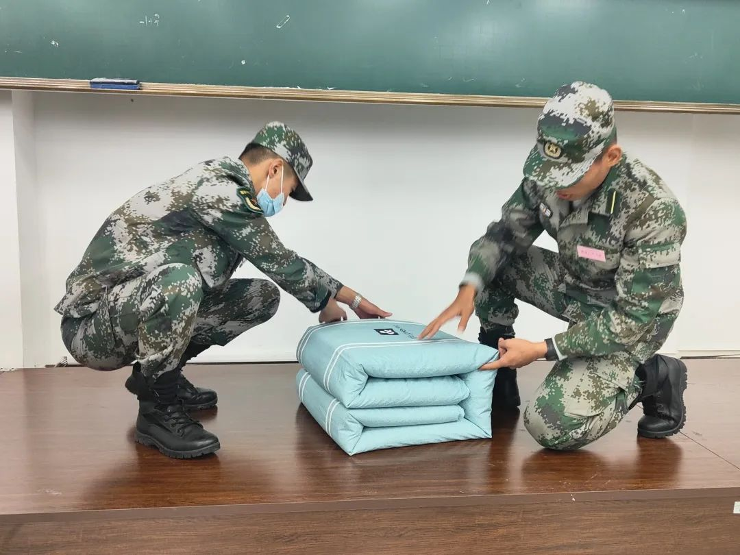 捏边、抠角、找平......一个个细微动作、一张张严肃认真的面孔,恍如“豆腐块”一般的行李映入眼帘,在军训中最难得便是学会自立,同学们一遍遍按照要求叠放行李,在坚持中收获成长。