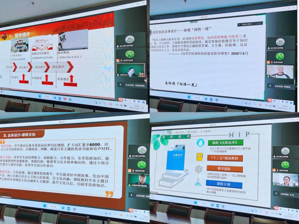 按照黑龙江省教育厅《关于开展黑龙江省第二届高等学校课程思政教学竞赛的通知》要求,学校于2022年12月5日在综合楼1515会议室,举办了第二届课程思政教学竞赛。竞赛采取线上线下相结合的方式,以遴选确定参加省赛选手。来自十个教学单位的15名选手通过学院选拔推荐参加了校赛。相关领导及专家担任此次竞赛的评委。