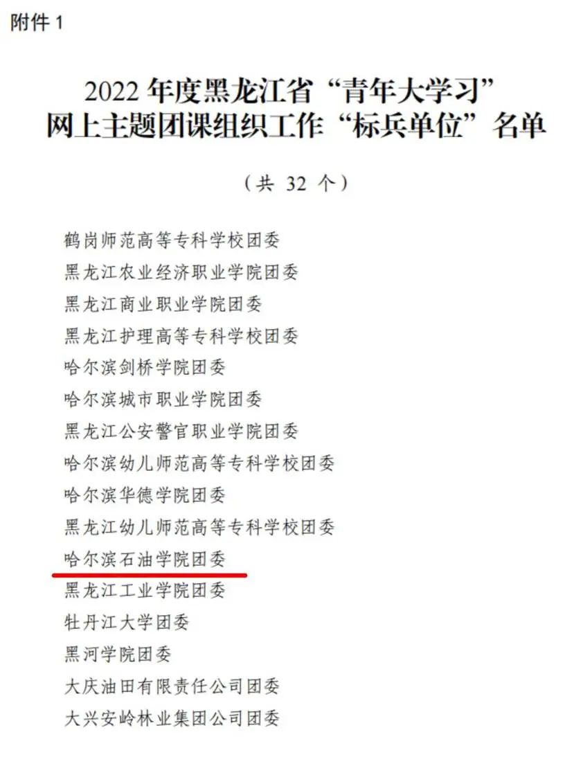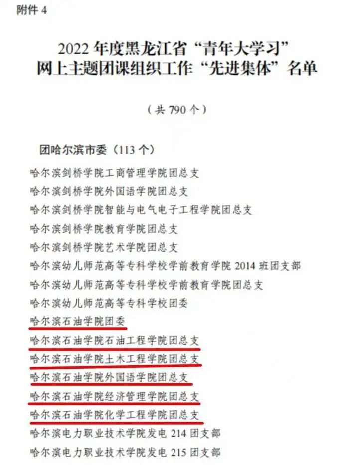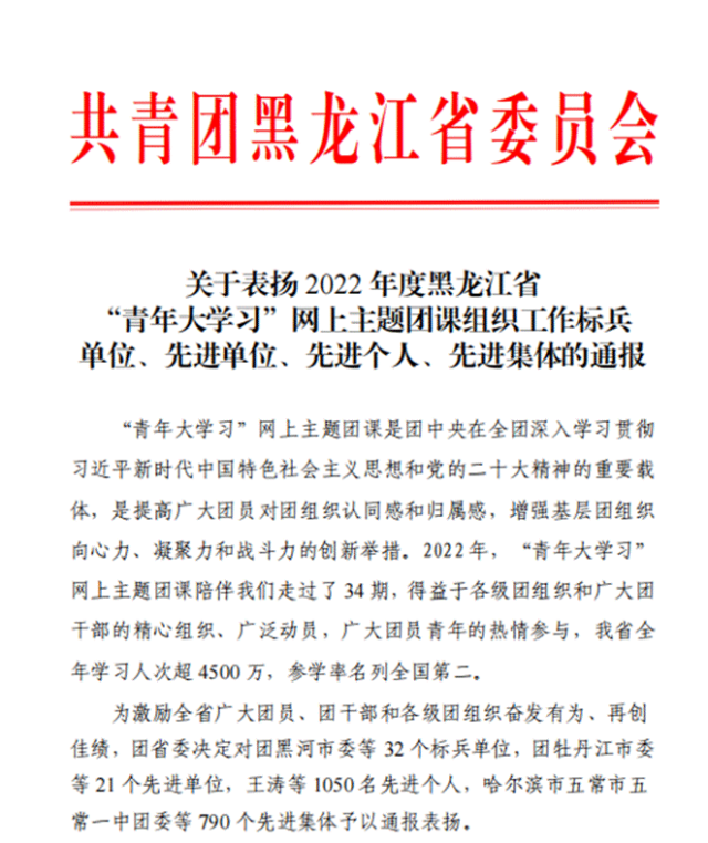 伟德bv国际体育团委、石油工程学院团总支、土木工程学院团总支、外国语学院团总支、经济管理学院团总支、化学工程学院团总支荣获2022年度黑龙江省“青年大学习”网上主题团课组织工作“先进集体”荣誉称号。