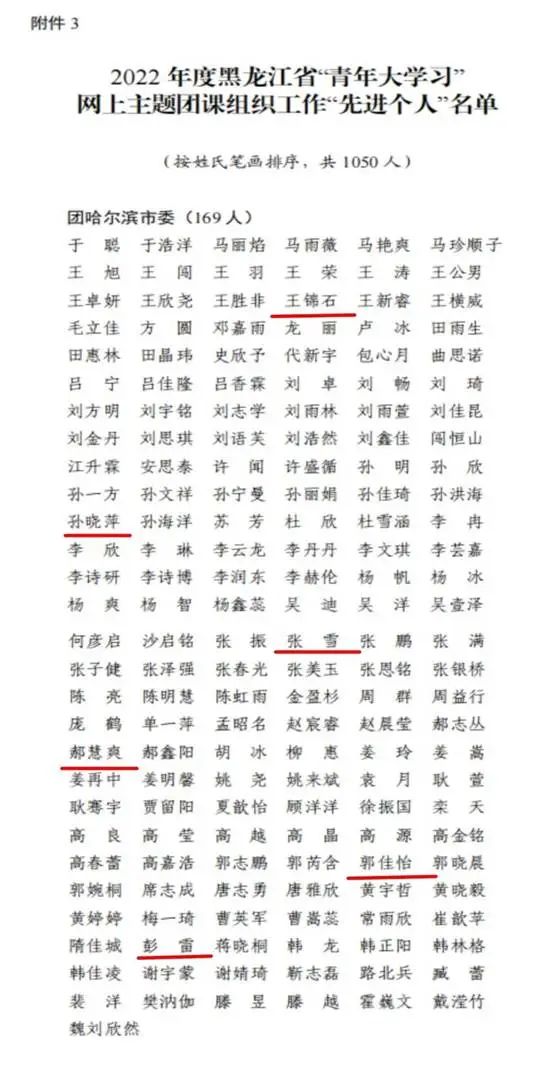 先进个人伟德官网团委书记王锦石、团委副书记彭雷、外国语学院党总支书记孙晓萍、石油工程学院党总支副书记张雪、校团委秘书处秘书长郭佳怡(学生)、化学工程学院团总支副书记郝慧爽(学生)荣获2022年度黑龙江省“青年大学习”网上主题团课组织工作“先进个人”荣誉称号 。