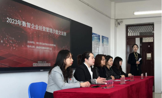 经济管理学院院长任洪云、院长助理宋蕾、新道科技股份有限公司黑龙江省区市场总监吴雪凌、服务总监富艳娇、服务经理崔丞丞及本次赛事的评委专家、部分院校指导教师出席,经济管理学院沙盘社指导教师刘芳欣主持本次开幕式。开幕式中,经济管理学院院长任洪云做开幕式致辞,新道科技股份有限公司黑龙江省区市场总监吴雪凌作为企业代表发言。