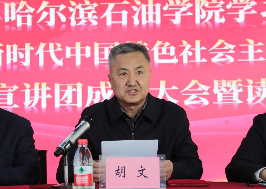 副校长胡文宣读《关于成立伟德bv国际体育学习贯彻习近平新时代中国特色社会主义思想主题教育理论宣讲团的决定》