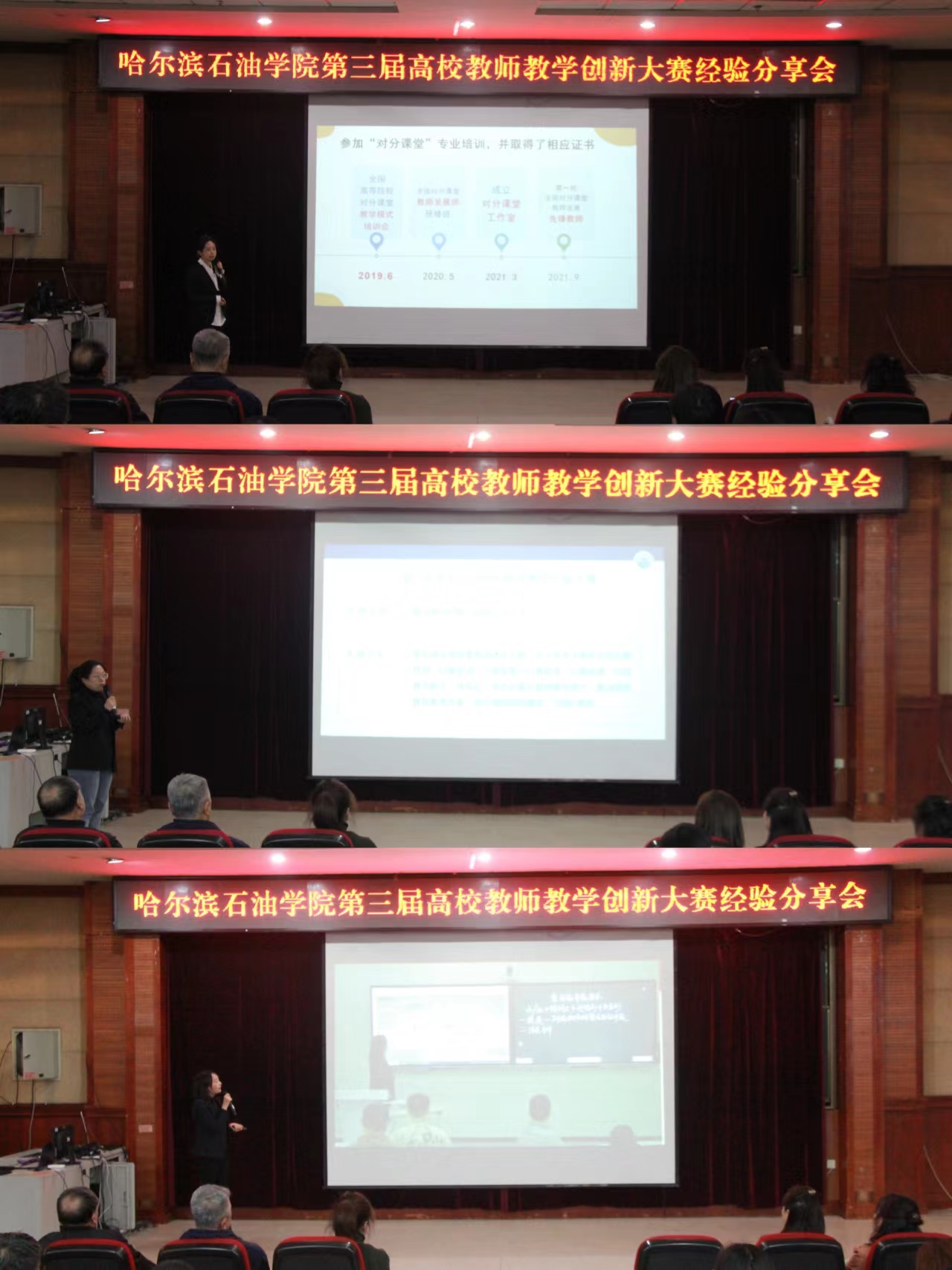 荣获新文科正高组三等奖的外国语学院高丽娜老师则从创新背景、痛点问题、创新理念及思路、创新方法及途径、创新教学成果及教学创新改革心得等六个方面对《综合英语》课程的教学创新进行了认真细致分享;荣获课程思政副高组三等奖的石油工程学院李萌老师结合《钻井工程》这门课程进行了以《承大庆精神立德以铁人榜样树人》为题的分享,并就如何将课程思政巧妙的融入到教学中及取得的成效,为现场参会教师一一进行了展示。