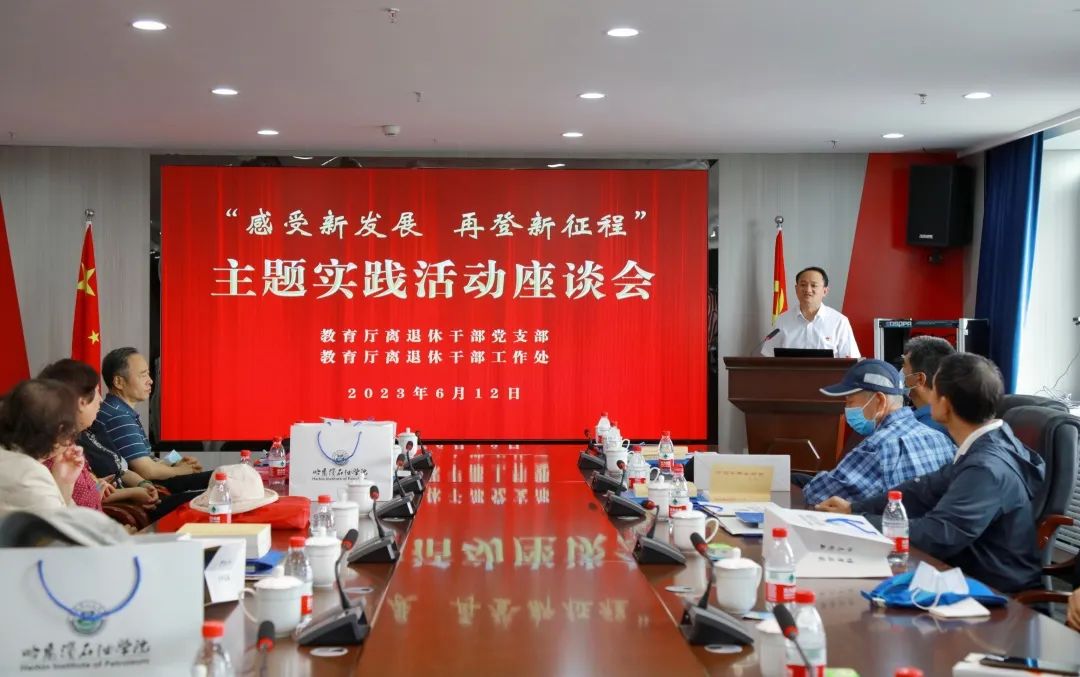 随后主题实践活动座谈会在综合楼1414会议室召开。党委书记林立民对省教育厅离退休党员干部一行来校开展主题实践活动表示热烈欢迎,对省教育厅老领导长期以来对学校发展的大力支持表示衷心感谢。林书记表示,学校党委深入贯彻落实新时代党的建设总要求,紧紧围绕“四讲四有”党员要求,持续推进“铁人先锋党建”品牌建设,努力探索构建“总支示范-创品牌”“支部创优-树样板”“党员践行-做先锋”“党政融合-促发展”的“四维一体”党建工作体系,以高质量党建引领推动学院事业高质量发展。他表示,学校全面建设的不断进步,离不开省委教育工委、省教育厅的坚强领导;推动学校事业又快又好发展,离不开各位老领导的关心与助力,希望离退休老领导能够继续一如既往地关心、支持学校,学校也将坚定信心、敢于担当、全力攻坚,努力为龙江高等教育高质量发展作出更大贡献。