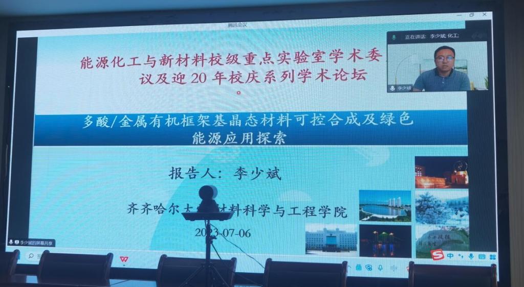 在学术论坛环节,史克英教授、张辉教授、于凯教授、李少斌教授分别作了题为《多维度、多晶相分级结构复合材料的可控制备及室温气敏性能研究》、《聚乙烯基绝缘材料添加剂作用机理研究》、《篮子型磷钼酸盐的功能化进程及其性能研究》和《多酸/金属有机框架基晶态材料可控合成及绿色能源应用探索》的学术报告,展示了四位专家学者所从事的研究方向以及取得的代表性研究成果。