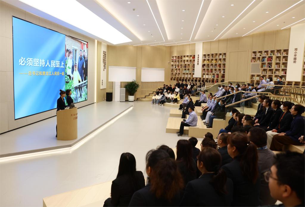 在主讲教师的带领下,全体人员依次参观了“我的家乡黑龙江”“总书记黑土情怀”“龙江‘四大精神’情景”“红色家风”“中国共产党人精神谱系”五个特色主题教室。在“声、光、电、景、影”的交融下,通过“唱”“讲”“演”“读”“听”等多维立体的方式,在“环绕剧场、时间轴、情景舞台、时空隧道”等多元丰富的教学场景中学习了系列主题微党课,对习近平总书记对龙江重要讲话重要指示批示精神进行再学习、再领会,深切感受到总书记的为民情怀、思想伟力和对黑龙江全面振兴发展的殷切期望,深刻学习感受到习近平新时代中国特色社会主义思想的丰富内涵和时代价值,深刻感受到中国共产党人百年奋斗的精神力量,深刻体会了龙江四大精神的生动实践,更加激发了大家身在最北方,心向党中央的情怀担当,更加坚定了永远跟党走的理想信念。