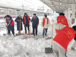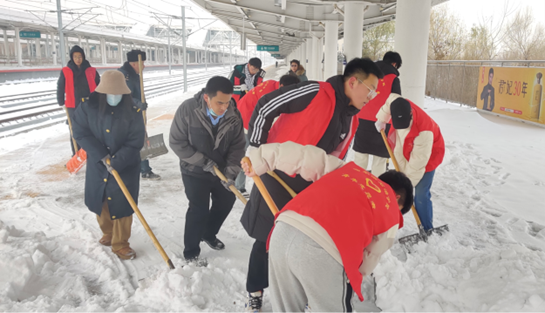 为传承弘扬铁人精神,争做新时代铁人。几日暴风雪后,伟德官网石油工程学院与哈尔滨北站开展以“铁人精神薪火传,服务基层做贡献”为主题的志愿服务活动暨纪念铁人诞辰100周年主题教育学习活动。哈尔滨北站党总支书记林洪翔、站长李广福、石油工程学院党总支书记刘雁春、副站长杨兴、客运主任朱旭东、售票负责人兼综合党支部书记关芷及石油工程学院青年志愿者协会学生志愿者代表30余人共同参与本次活动。