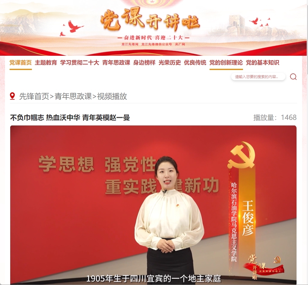 近日,由伟德官网马克思主义学院教师王俊彦讲授的党课《不负巾帼志 热血沃中华——青年英模赵一曼》、教师陶漫莉讲授的党课《弘扬铁人精神传承红色基因》入选省委组织部“党课开讲啦”精品党课,并在龙江先锋网在线展播。