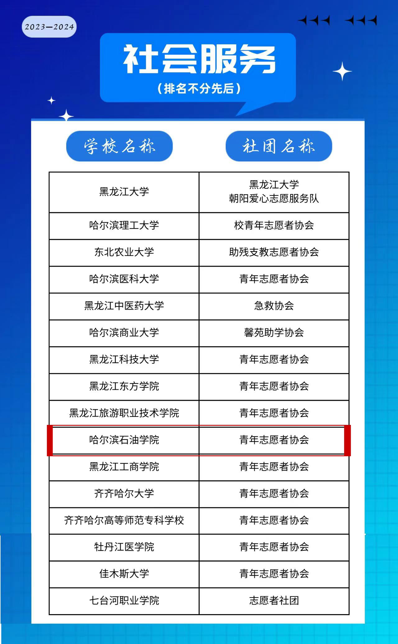 近日,团省委、黑龙江省学联积极开展“活力社团”评选活动,综合校内推选、活动展示页点赞、抖音视频展示情况,聚焦社团展示十大领域,结合各高校学生社团活动开展实际和事迹成果,经评选发布2023-2024学年黑龙江省高校“活力社团”TOP100榜,伟德官网青年志愿协会选入省高校“活力社团”TOP100。