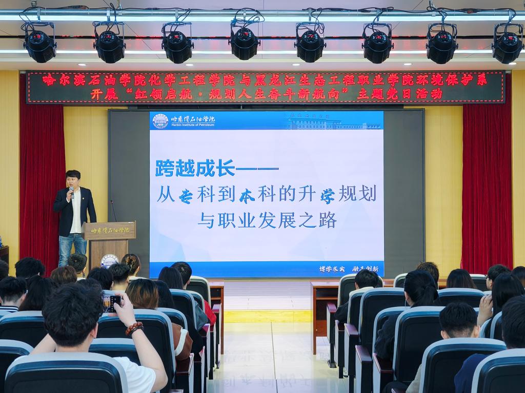 致辞结束后,副院长彭殿宝以《跨越·成长——从专科到本科的升学规划与职业发展之路》为题开展讲座。他围绕政策解读、党建融合、时代需求三大维度,强调"生涯选择须锚定国家战略,在龙江振兴中找准坐标"。结合典型案例,为学生提供实用规划建议,号召青年学子以专业本领勇担时代重任,深植"国之大者"情怀,推动个人成长与民族复兴同频共振。