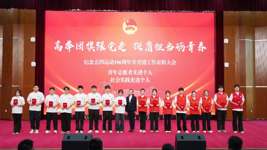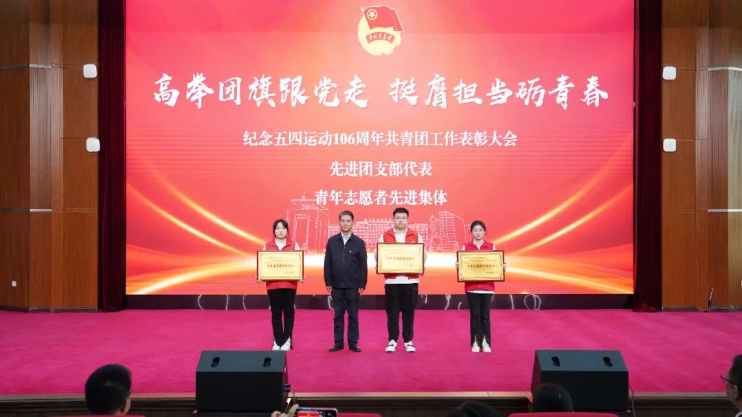 校领导为荣获“青年志愿者先进个人代表”“社会实践先进个人代表”“优秀团员标兵代表”“优秀团员代表”“优秀团干部标兵代表”“优秀团干部代表”“先进团支部代表”“青年志愿者先进集体”“先进团总支”等奖项的集体及个人代表颁奖。